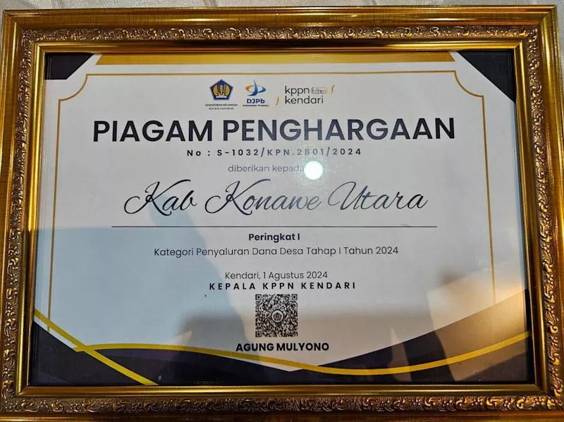 Selasa 6 Agustus 2024, Pemda Konut kembali meraih penghargaan dari Kantor Wilayah Direktorat Jenderal Perbendaharaan Provinsi Sultra atas predikat meraih juara 1 dalam program penyaluran dana desa tahap 1 terbaik se-Sultra.