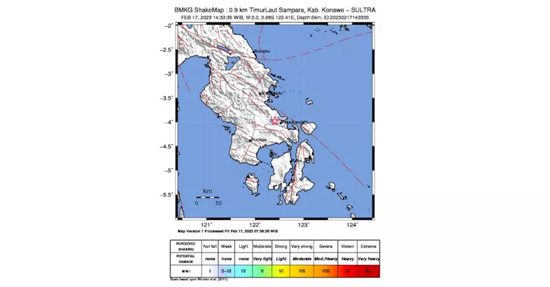 Kepala BMKG Kendari, Rudin mengatakan berdasarkan hasil analisis, menunjukkan informasi gempa bumi yang berkekuatan berkekuatan 3,4 SR itu terletak pada koordinat 3.98  LS, 122.41 BT, atau tepatnya berlokasi di darat pada jarak 0.9 kilometer, Timur Laut Sampara, Kabupaten Konawe Provinsi Sultra, pada kedalaman 5 kilometer.
