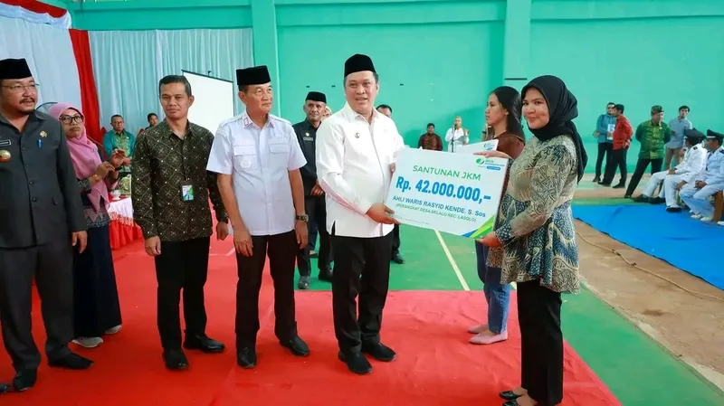 Dikegiatan itu juga, dilakukan penyerahan santunan sebesar Rp 42 juta rupiah kepada 2 keluarga ahli waris aparat desa yang meninggal dunia.