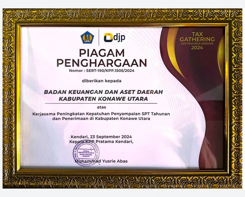 Sultralink.com, Kendari – Badan Keuangan Dan Daerah (BKAD) Konawe Utara mendapat penghargaan dari Kantor Pelayanan Pajak (KPP) Pratama Kendari di acara Tax Gathering yang diadakan Kantor Pelayanan Pajak (KPP) Pratama Kendari.