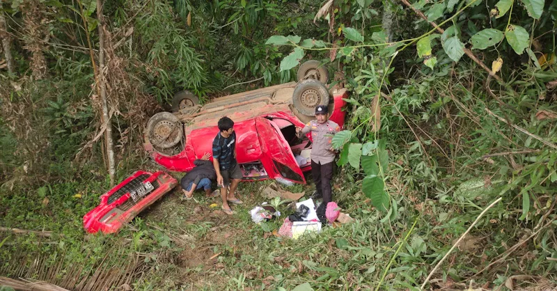 Mobil yang dikendarainya alami kecelakaan, masuk jurang setelah sebuah mobil merk wuling DT 1517 DM alami pecah ban pada bagian belakang saat akan melambung mobil yang dikendarai Pj Kades Andeo.