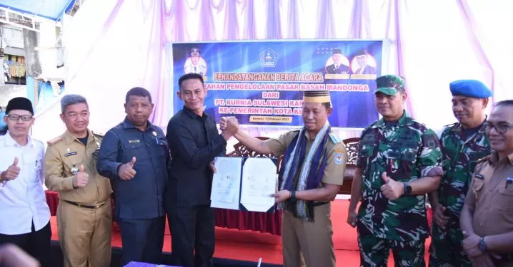 SultraLink.com, Kendari – Pemerintah Kota (Pemkot) Kendari, Provinsi Sulawesi Tenggara (Sultra) secara resmi mengambil alih pengelolaan Pasar Basah Mandonga, dari PT Kurnia Sulawesi Karyatama. Prosesi penyerahan pengelolaan pasar ditandai dengan penandatanganan berita acara, disaksikan para pedagang, pada Senin (13/2/2023), di halaman pasar Mandonga.