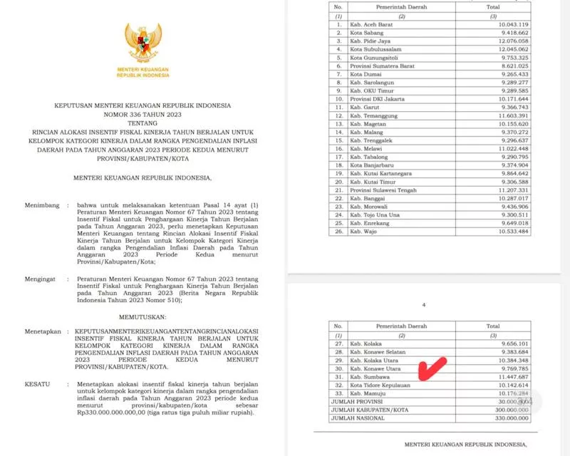 Ketentuan itu, berdasarkan Keputusan Kementerian Keuangan (Kemenkeu RI) nomor 336 Tahun 2023 tentang rincian alokasi insentif fiskal kinerja tahun berjalan untuk kelompok kategori kinerja dalam rangka pengendalian inflasi daerah pada tahun anggaran 2023.