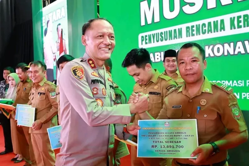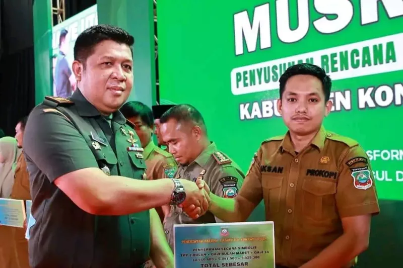 Dalam acara itu bupati juga menyerahkan secara simbolis Tambahan Penghasilan Pegawai (TPP) bagi ASN Pemda Konut kepada perwakilan tiap Eselon.
