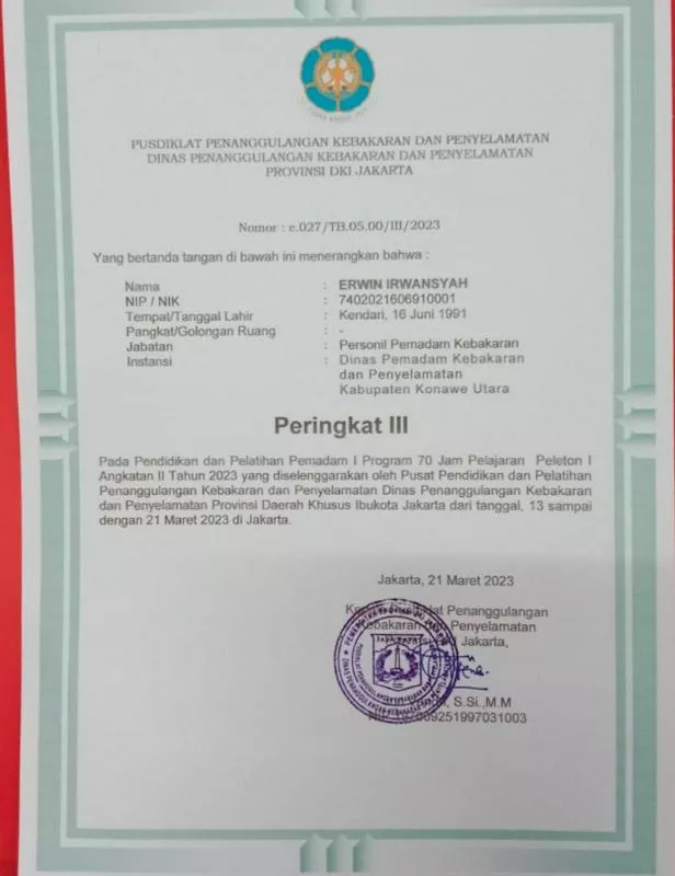 “Kemarin kami kirim 13 personil Damkar Konut untuk ikut pendidikan Pusdiklatkar di Ciracas. Semua biyaya di tanggung oleh Dinas Damkar Konut. Alhamdulillah semua sudah kembali dengan sehat dan selamat. Serta siap melayani masyarakat 24 jam dibidang kebakaran dan penyelamatan,”tegasnya.
