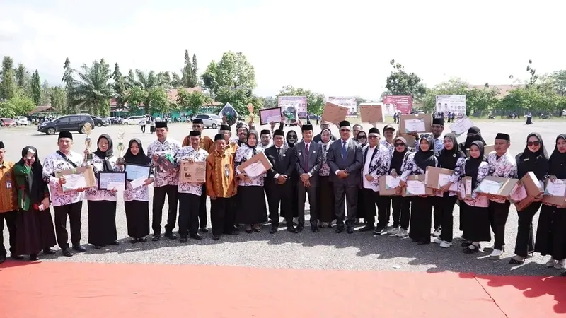 Bupati menyerahkan bantuan laptop kepada guru penggerak jenjang SD dan SMP, seragam sekolah untuk siswa SMP, serta Chromebook sebagai pendukung pembelajaran berbasis teknologi untuk SD dan SMP.